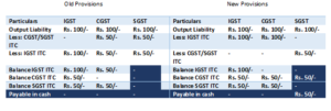 As is evident from the table, under the old provisions, the entire amount of ITC was utilised and no amount of GST was payable in cash. However, under the new provisions, CGST ITC to the extent of Rs. 50/- remains unutilized and SGST liability to the extent of Rs. 50/- is payable in cash.